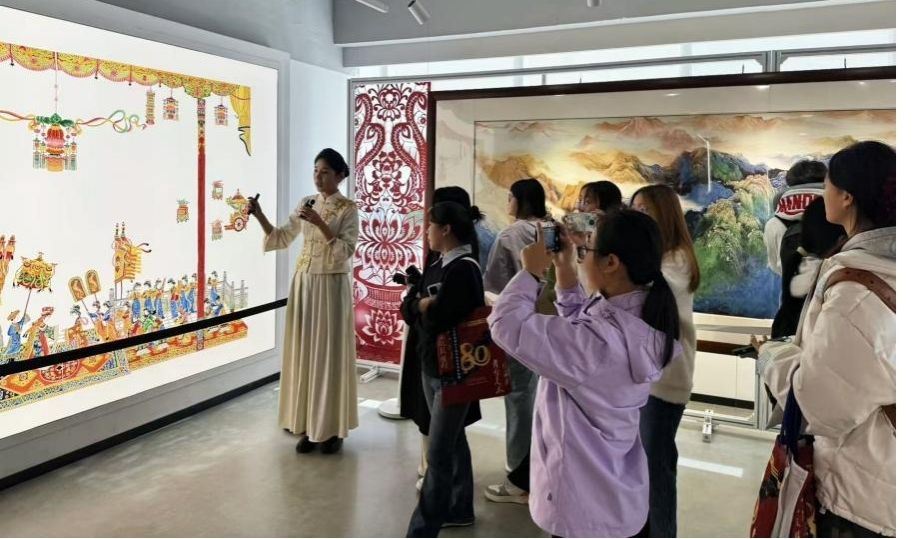 实践活动的最后一站,师生们来到了陕西省文化馆,重点参观了陕西省非物质文化遗产体验中心。在这里浸润三秦非遗,体验活态传承,华县皮影、凤翔木版年画、陕北剪纸、西安鼓乐等丰富多彩、底蕴深厚的陕西非遗项目集中展示,令同学们目不暇接。学生们不仅近距离观赏了精美的非遗作品,更在传承人的指导下,亲身体验了部分非遗项目的制作环节,感受传统手工艺的温度与智慧。