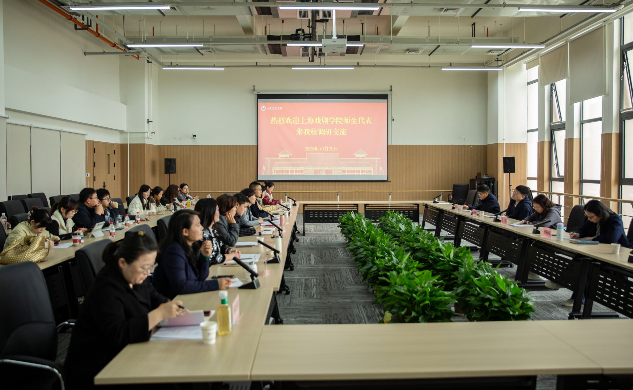10月29日下午,由上海戏剧学院戏剧文学系党总支书记方军带队,师生一行14人莅临我校开展调研交流,座谈会在戏剧教学楼二楼多功能厅召开,我校教务处、戏剧文学系、宣传部、学工部等相关部门老师及学生代表参加座谈。会议由教务处负责人张雪主持。