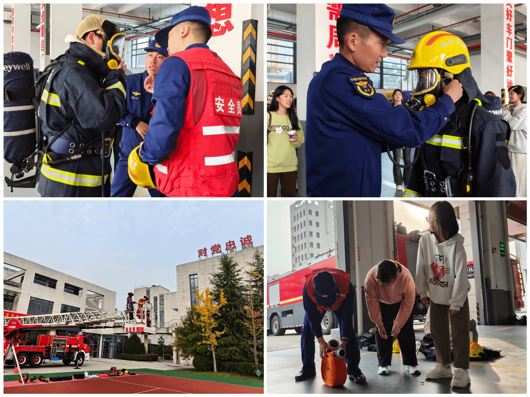 随后,师生一行前往沣西新城消防救援大队。在这里,同学们近距离参观了消防车辆与专业器材,并在消防员的专业指导下,沉浸式体验了穿戴消防服、乘坐云梯车、操作消防器械等环节。一位参与体验的同学感慨道:“这身装备比想象中沉重太多,真正体会到消防员逆行火场的英勇与担当!”